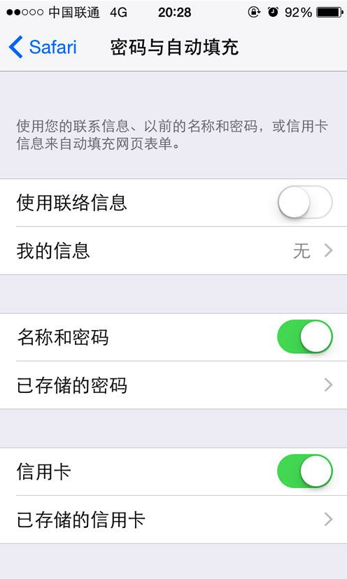 7. iOS 8 系統中,我們可以通過以下途徑添加信用卡:設置 > Safari > 密碼與自動填充,還可以拍照識別卡號。