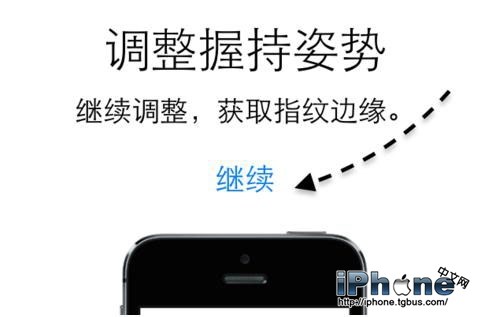 9、當上面的指紋記錄完成以後,接下來還會記錄一次。這次主要是識別平時用手指按Home鍵的姿勢,根據自己平時用手指按鍵的習慣來操作。點擊“繼續”。