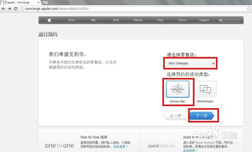 在預約頁面選擇你所在區域的零售店“Mixc Chengdu(成都, 成都萬象城店),預約的活動類型選擇Genius Bar(天才吧)。選擇完成後點擊按鈕“下一步”。