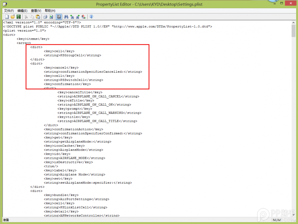 ④ 使用pledit.exe打開Settings.plist,在裡面的第一個後面按一下換行,然後添加以下代碼,然後保存。
