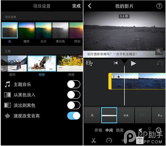 這其中也有不同的主題風格可選,如明快、旅行、新聞等形式,而我選擇的是明快。後來發現其實按照自己的想法添加音樂以及視頻濾鏡也完全可行。