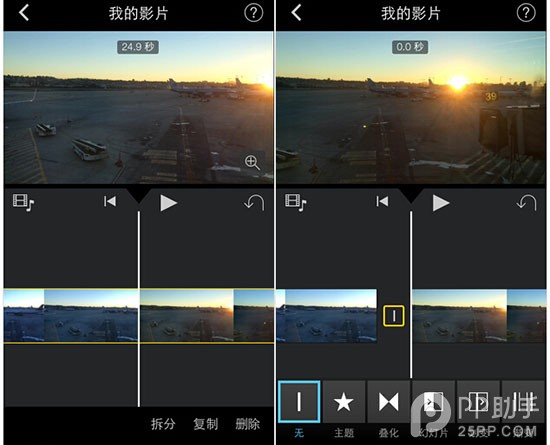 當然,一段完整的視頻剪掉一部分之後難免不完整了,為了讓各片段在播放時銜接完整,你需要在段與段之間添加轉場效果。iMovie提供了5種轉場效果:主題、疊化、幻燈片、劃變、漸變。轉場效果不宜頻繁更換,統一選擇疊化或者漸變即可。