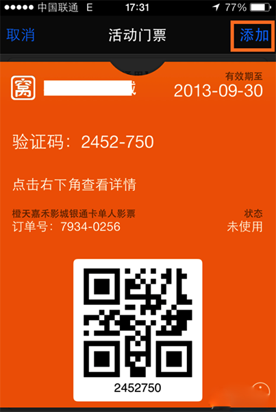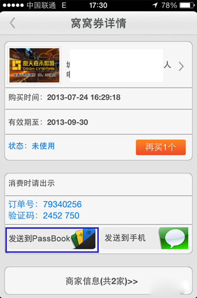 2、在已經購買的團購劵中點擊要添加到 Passbook 中的電影票,如圖所示
