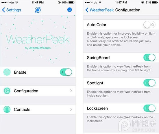 iOS8.4越獄後必裝插件有哪些了,對於那些對天氣比較依賴的人,他們就希望在手機能隨處看到天氣信息,並且還不要擋著當前的內容。WeatherPeek正是這樣能夠滿足他們需求的人WeatherPeek 是一款可以讓你快速對天氣信息進行查看的插件,因為安裝了這款插件後,天氣信息將會在鎖屏、主屏或者是 Spotlight 出現。