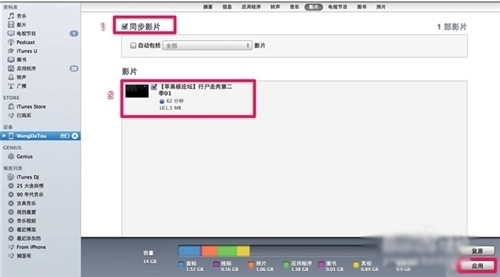 點擊左側列表裡你的設備,勾選“同步影片”,勾選需要同步的影片,最後點“應用”。