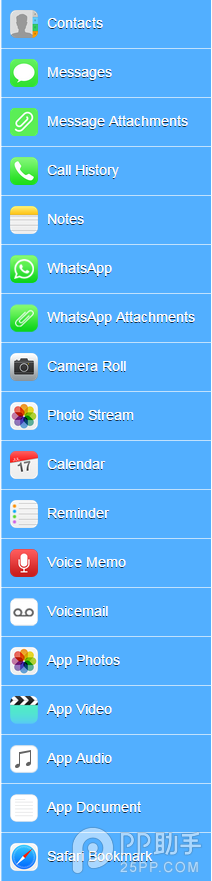iFonebox for Mac 恢復軟件支持恢復的數據非常多,比如 通訊錄,信息,短信的附件,通話記錄,備忘錄,WhatsApp數據(他們是海外軟件,所以有這個,國內人用的基本是微信),照片,圖片,日歷,提醒,錄音,應用圖片數據,我直接從他們網站上截圖給大家看一下,看圖標吧,他們是英文的。