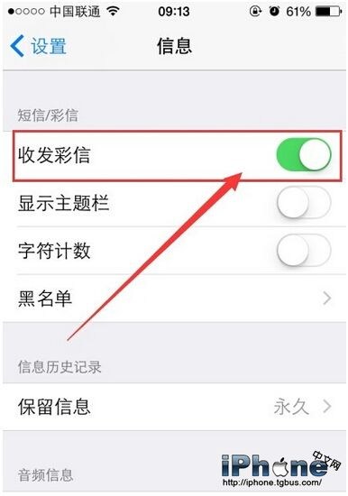 進入【信息】以後,在【信息設置】找到【收發彩信】把它打開。