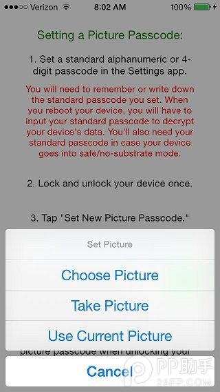 今天為大家帶來一款鎖屏密碼界面替換插件,Picture Passcode 可以允許用戶選擇任何圖片作為鎖屏壁紙,然後選擇幾個特定的點來讓你按順序對設備進行解鎖。由於這些特定的點是隱藏的,所以只有你自己在設置的時候才能知道,這就很好地為 iOS 設備增加了安全性。
