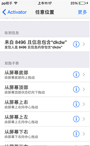 進行【設置】-【Activator】-【任意位置】,點擊右上角的更多,則能夠看到一個【收到信息】的選項,在其中設置發信人以及信息內容,我們暫時將信息內容設定成“dkdw”,確定保存返回至【任意位置】界面,一直往下翻,我們就能夠看到你剛才的收到信息的設置。