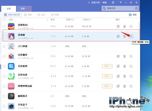 根據提示將iPhone/iPad/iPod連接到電腦上,等待pp助手顯示出你的設備,找到游戲位置,點擊應用。