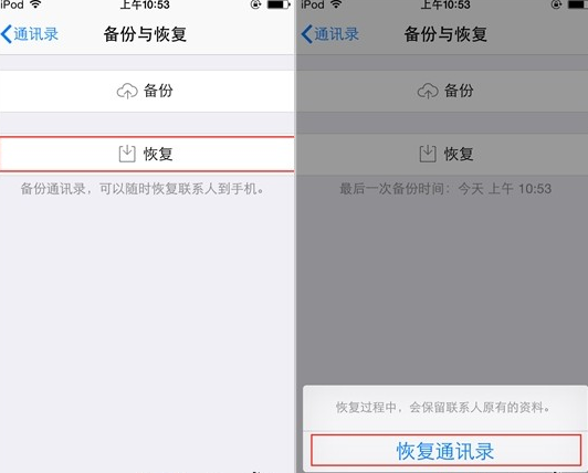 4.按照同上步驟,在新的iPhone5s活其他設備上,選擇“恢復”,就可以將雲端的通訊錄備份直接導入新的設備內。