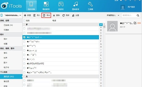 2.在通訊錄中找到需要備份的個人、分組、或者選擇全部備份。點擊“導出”,即可將通訊錄備份到PC上。