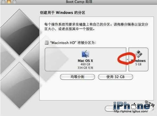 b. 打開BootCamp助理,點擊繼續,調整Windows分區大小(鼠標移到到紅圈處,按住鼠標左鍵左右移),確定好大小好,點擊分區