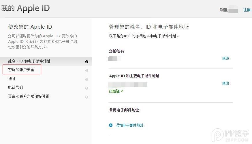 4.登陸之後,我們將看到自己的賬戶個人信息,在左側對話框中選擇“密碼和賬戶安全”,這時候,頁面中將會顯示我們之前所設定的安全提示問題,若想要涉及Apple ID的帳戶安全操作時,必須要輸入事先設置的正確答案。很顯然,這個答案就是我們今天要找回的內容。