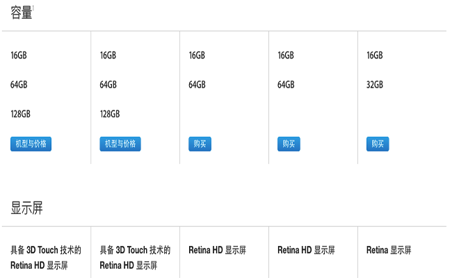 容量上,新款的 iphone6s 以及 iphone6s plus 相比上一代的 iPhone6 以及 iPhone6 plus 多出一個 128G 版本選擇,同時這兩代機型都取消了 32G 版本。而 iPhone5s 則保留了 32G 版本的選擇。顯示屏上,新款的 iphone6s 以及 iphone6s plus 升級到了「具備 3D Touch 技術的 Retina HD」 顯示屏。