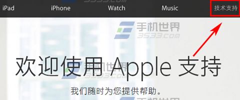 1)在蘋果官網首頁,點擊上方一欄的【技術支持】。(如下圖)