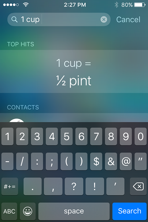 功能缺失以及速度慢,更令人糟心的是,由於 iPhone 4s 屏幕小,內容顯得十分擁擠。有一些屬於 iOS 8 的剩余殘渣——鍵盤輸入建議占了很大一塊屏幕空間。當屏幕上有鍵盤的時候, Spotlight 屏幕無法顯示超過 1 個搜索結果!到了 iOS 9,屏幕擁擠的問題似乎變得更加嚴重了,按鍵更大,有過之而無不及。