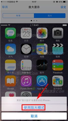2)選擇【放大】切換到放大模式,再點擊【設定】,在彈出框點擊【使用放大模式】,然後手機會自動重啟。(如下圖)