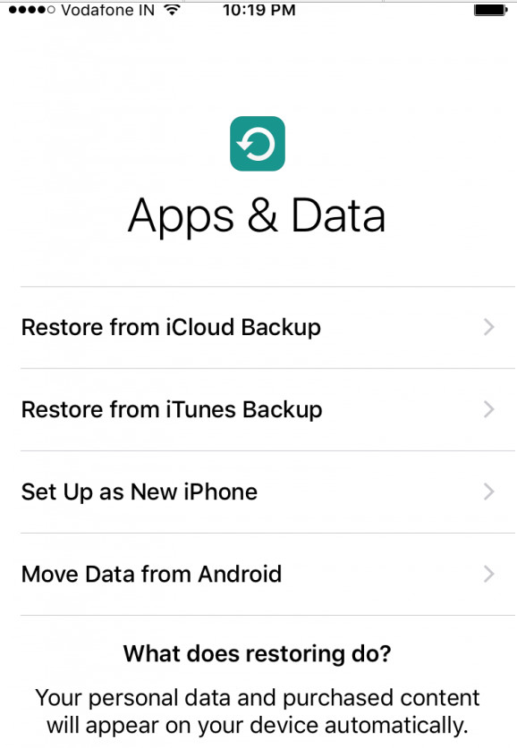 1.在 iPhone 或者 iPad 上,當你進入到一部 iOS 9 開機設置(初次激活或重新設置為新機都可能出現)“應用&數據”的時候,你可以看到“從安卓移動數據”的選項(如下圖)。