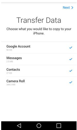5.選擇你要轉移的數據,並點擊“Next”開始傳輸,你可以轉移聯系人、信息、照片、視頻、書簽、Google 賬戶和日歷。值得一提的是,你能夠轉移的數據類型取決於你擁有的安卓設備。另外,數據傳輸的時間基於數據的大小,一般會花費幾分鐘的時間。