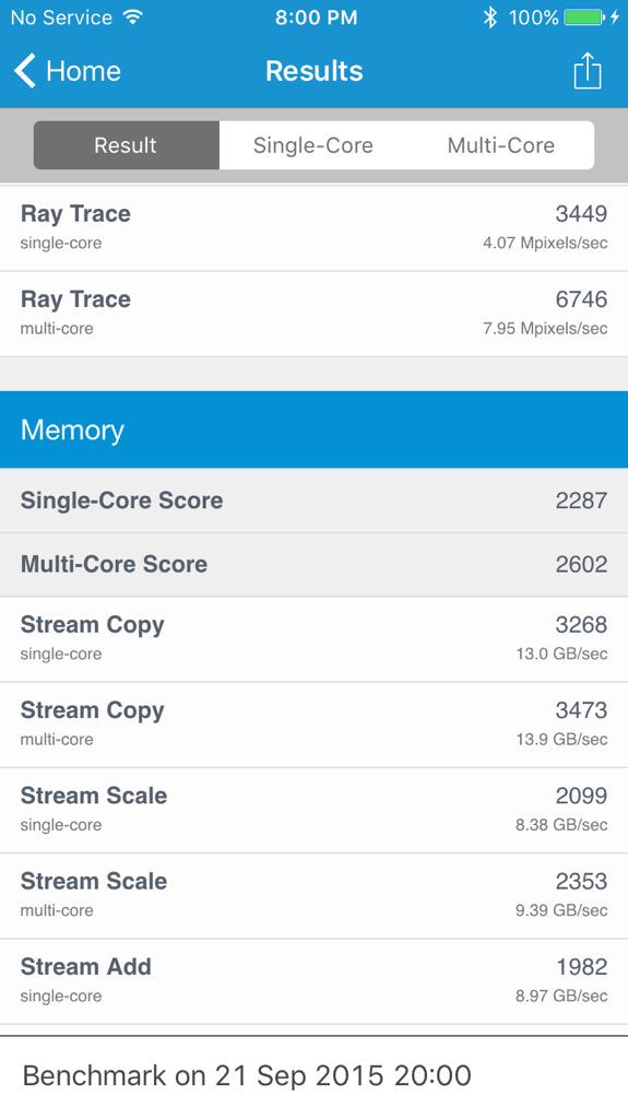 去年,iPhone6的單核跑分為1613,iPhone6 Plus的跑分為1609。iPhone5s的跑分為1400,iPhone5的跑分為710,iPhone5c的跑分為695。iPad Air2的跑分為1808,iPad Air的跑分為1473。iPhone6s的性能跑分是iPhone6的1.5倍。