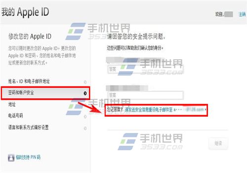 5)登陸後,在左側對話框中選擇【密碼和賬戶安全】,再點擊安全提示問題下面的【發送安全信息重設電子郵件至XXX安全郵箱】。(如下圖)