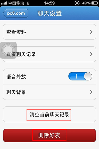 另外點擊聊天對話框那個人頭就能單獨刪除與此好友的聊天記錄或者查看本好友個人資料、設置聊天背景、刪除好友。