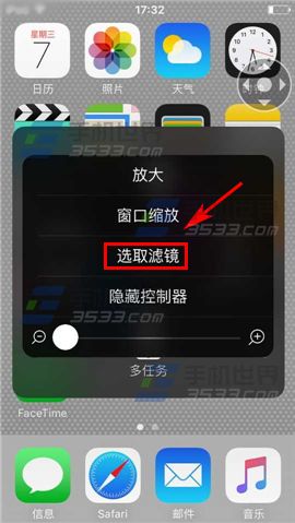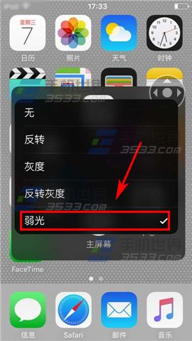4)然後快速連續按三成【Home鍵】,出現一個帶【方向導航】的按鈕,點擊它,出來一個菜單,選擇【選取濾鏡】,再選擇【弱光】,現在屏幕就暗下來了。(如下圖)