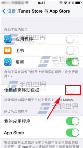 點擊設置進入,然後點選【App Store與iTunes Store】一欄,進入後關閉【使用蜂窩移動數據】右邊滑塊即可。(如下圖)