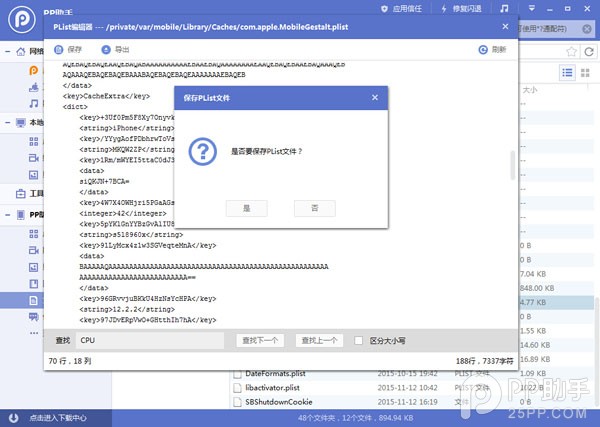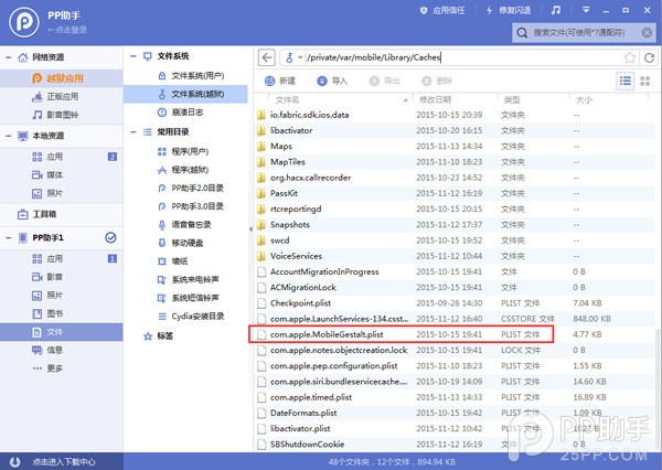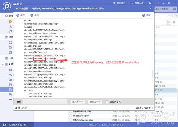(2)在【文件系統(越獄)】中找到路徑【/private/var/mobile/Library/Caches/】,然後打開【com.apple.MobileGestalt.plist】文件,分別修改型號、固件版本號和處理器型號,如下圖: