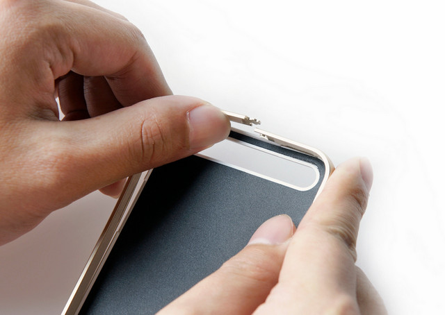 酷殼iPhone6 Plus款采用邊框與後殼分離的設計,安裝時需要先將邊框卸下。