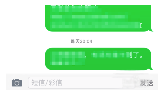 2、如下圖所示中自己發出的短信背景顏色顯示為綠色,說明當前是使用的傳統運營商的短信,即移動、電信和聯通的。另外在短信文字輸入框中還可以看到有“短信/彩信”字樣的提示。