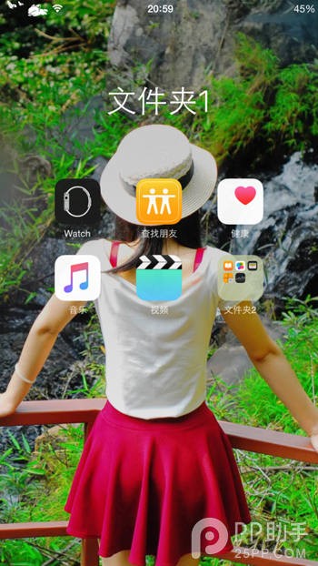 1、首先建立兩個文件夾!然後把第一個文件夾(下稱文件夾1)放到屏幕圖標第二個位置上,如圖一樣,然後把要隱藏的App放到第二個文件夾(文件夾2)裡,這裡演示的是隱藏【天氣】和【郵件】圖標。