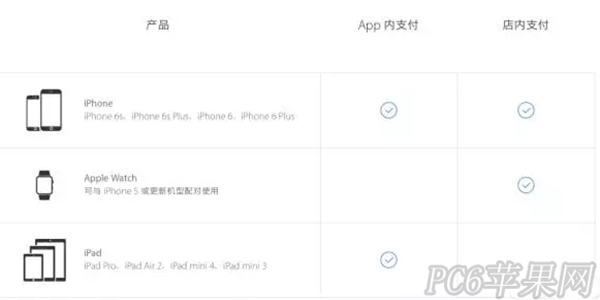 值得一提的是,Apple Watch 只能應用在商店,不能應在是應用支付當中,而 iPad Air 2、iPad mini 3、iPad mini 4 以及 iPad Pro 僅應用在應用支付當中,不能應用在商店當中,而 iPhone 6S、iPhone 6S Plus、iPhone 6、iPhone 6 Plus 均可應用。