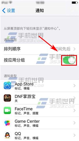 點擊設置進入,然後點擊【通知】一欄,再開啟【按應用分組】右邊滑塊即可。(如下圖)