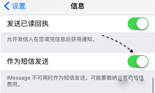 6、對於打開了 iMessage 的用戶,最好是在【設置-信息】中,打開【作為短信發送】選項。這樣一來,當網絡不通暢時,或沒有網絡時,便會自動以傳統短信來發送。