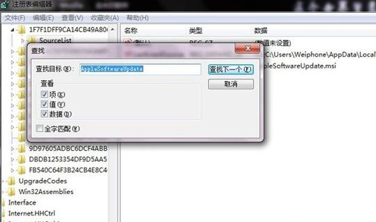 2. 使用組合鍵Ctrl+F調出搜索框,輸入Apple Software Update,並點擊查找下一個,注冊表編輯器右邊的框裡就會出現 Apple Software Update項,我們要做的就是將該項刪除。