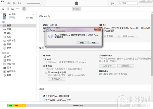 3、設備連接iTunes,按住鍵盤上的Shift鍵(Mac系統上按住alt鍵),鼠標點擊“恢復iPhone”,選擇已下載好的iOS9.2固件,確認恢復之後等待iTunes自動運行完成即可。