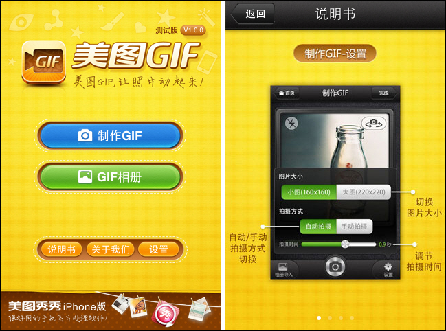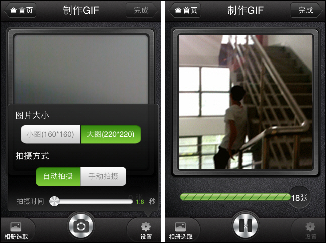 STEP3:從說明書界面返回進入制作GIF界面,開始拍攝吧。不過建議大家拍攝前先調出設置界面,選擇大圖或者小圖尺寸,要自動拍攝還是手動拍攝。選擇自動拍攝時,拍攝時間調節的越長,拍照間隔就越長,不過默認的就挺合適了。一切准備妥當就按下拍攝按鈕吧,美圖GIF將自動連拍下整個創意現場。