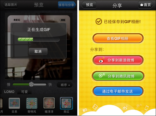 STEP5:覺得OK了就點一下右上角“保存與分享”按鈕,軟件會自動生成GIF動態圖並保存到GIF相冊裡;而且還可以一鍵分享至微博。引來N多粉絲圍觀拍磚時,大家可要hold住啊!