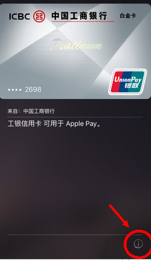 1、進入設備Wallet頁面,點擊已綁定的工行卡的卡面,然後點擊右下角圓形感歎號按鈕;