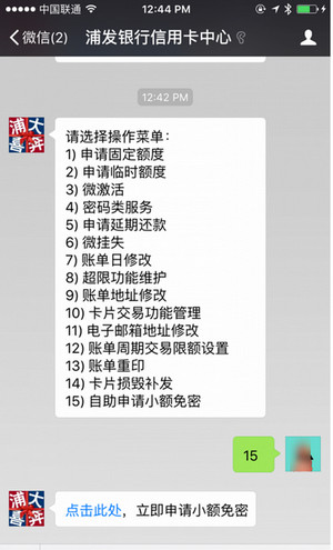 2、通過浦發微信號【浦發銀行信用卡中心】開通:進入公眾號之後點擊【微服務-賬戶維護-自助申請小額免密】,確認開通即可。