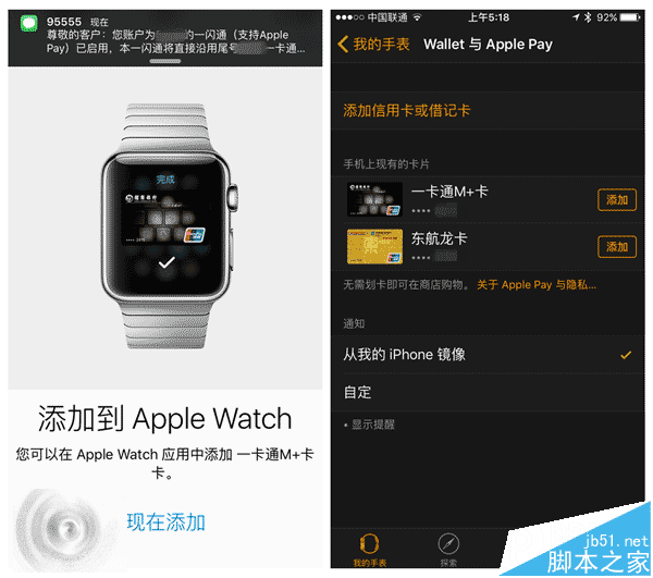 ▼如果你有Apple Watch的話,還可以進一步將銀行卡添加到Apple Watch上。需要先打開Watch應用,然後選擇“Wallet和Apple Pay”,之後就可以直接添加銀行卡或從手機上添加過來,無論是哪種方式,都需要重新進行一次驗證過程。在綁定過程中,iOS還會要求你必須為蘋果手表設定解鎖密碼,否則無法使用。如果綁定過多張銀行卡,也可以選擇將哪張銀行卡關聯至Apple Watch: