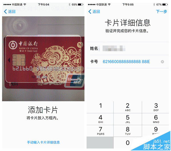 直接用攝像頭掃描或者點下方的“手動輸入卡片詳細信息”都可以,識別卡號後輸入姓名,然後點擊“下一步”,按照提示操作就可以了,步驟與上方一致。