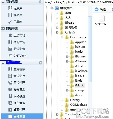 2、用iTools或者pp助手、ifunbox之類的軟件的文件管理功能找到QQ音樂下的這個文件夾(/Library/Caches/iMusic),如圖: