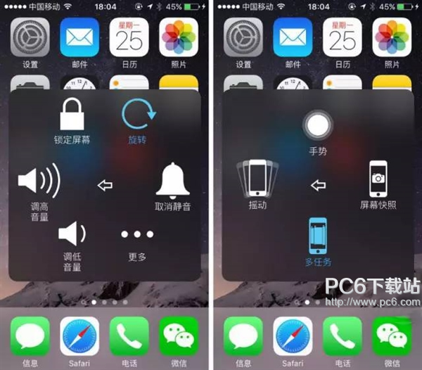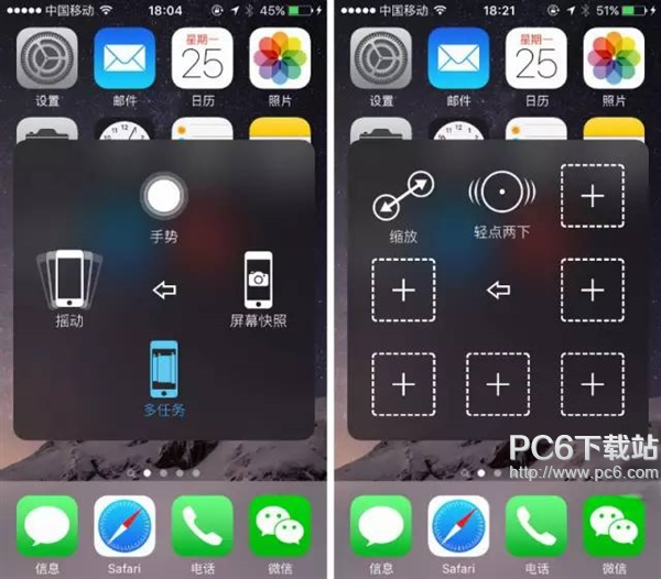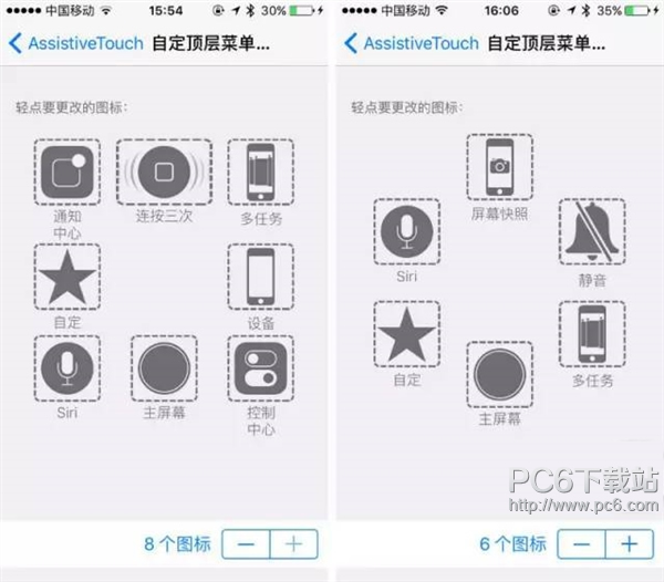 增加“多任務”“屏幕快照”兩個常用功能,非iPhone 6s和iPhone 6s Plus的用戶建議增添“靜音”。