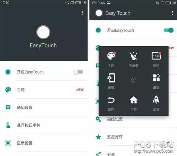 相較於iPhone的小圓點,Android的Easy Touch非常靈活。懸浮面板、按鈕都可以自定義,甚至不需要root就可以把懸浮按鈕設置為返回鍵。除此之外,還兼有非常具Android特色的熱門功能——一鍵清理緩存,加速手機運行速度。