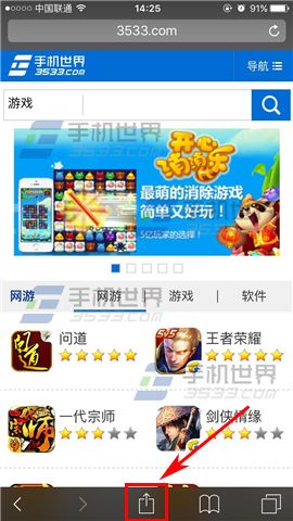 1)首先我們先打開【Siri】,然後打開你要進行操作的網站或網頁後點擊中下方的【分享】按鈕。(如下圖)