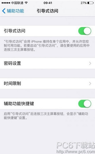 第一步,在iPhone主屏幕上打開設置-通用-輔助功能,在窗口的最下方點擊引導式訪問並開啟。然後,我們可以根據自己的需求設置密碼、時間限制。而在開啟輔助功能快捷鍵之後,我們只需要連按3次Home鍵就能啟動該功能。