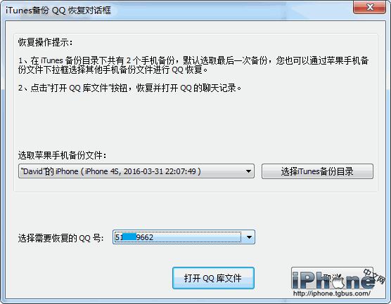 在“iTunes備份QQ恢復”對話框中,如下圖點擊“打開QQ庫文件”按鈕,就能查看需要恢復QQ號的聊天記錄了。如果有多個QQ號,可以通過QQ號的下拉框進行選擇。